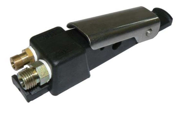 Der PanBlast™ AirStop pneumatische Totmanneinrichtung ist ein nicht entlüftender Totmanneinrichtung, der die Steuerluft zum Strahlgerät unterbricht, wenn der Griff losgelassen wird. Der Griff ist für ein Zweileitungsschlauchsystem ausgelegt. Die NPT-Konfiguration ist mit den meisten amerikanischen Strahlgeräten kompatibel.