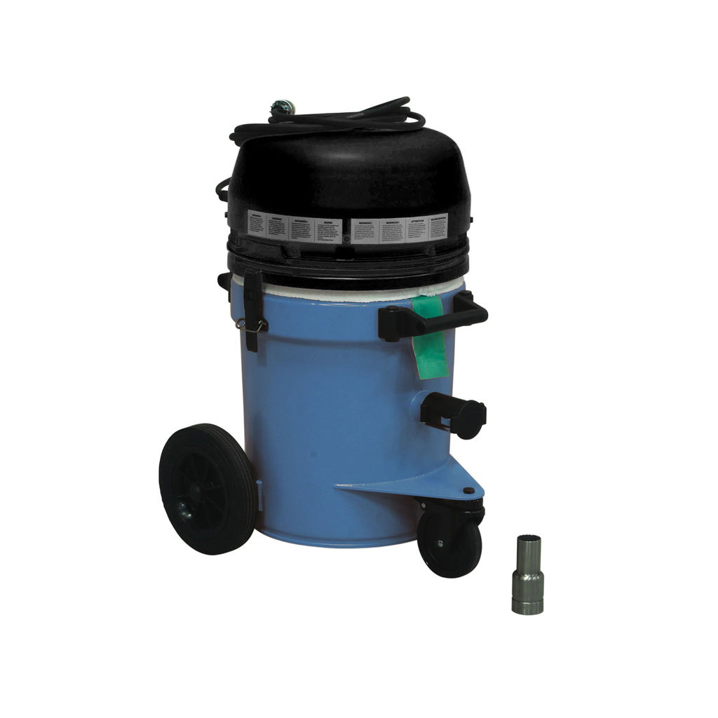The electrically driven (Bb) 104E is a compact and robust vacuum unit suitable for general cleaning and vacuuming dry materials over a short distance. Equipped with a steel drum on wheels it can be used anywhere where compressed air is available. Sucked up material is collected in this mobile collection unit. The filter bag ensures clean exhaust air.