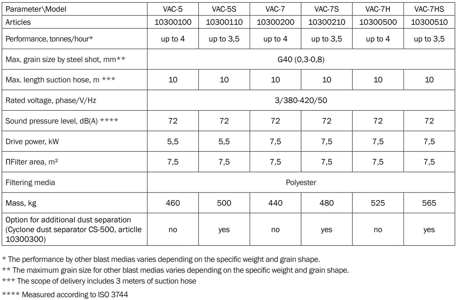 • VAC-7S : Spécialement conçu pour les abrasifs minéraux, qui génèrent généralement plus de poussière. Cette version comprend un pré-séparateur (SC-500) permettant de séparer efficacement la poussière et les particules indésirables, rendant le nettoyage encore plus efficace.